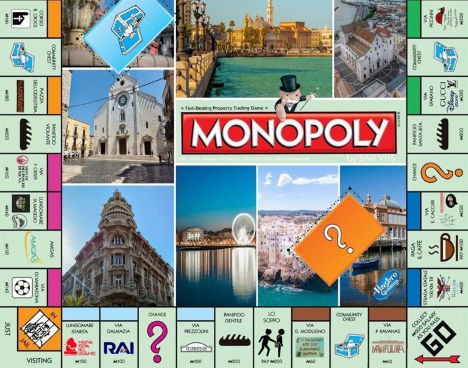 Un’idea originale e divertente quella di produrre la versione barese del Monopoly, un’idea diffusa sui social dal gruppo Facebook Bari Vhs che ha pubblicato il colorato tabellone e le carte per giocare personalizzate in versione barese, per una serata tra i luoghi simbolo della città di San Nicola.