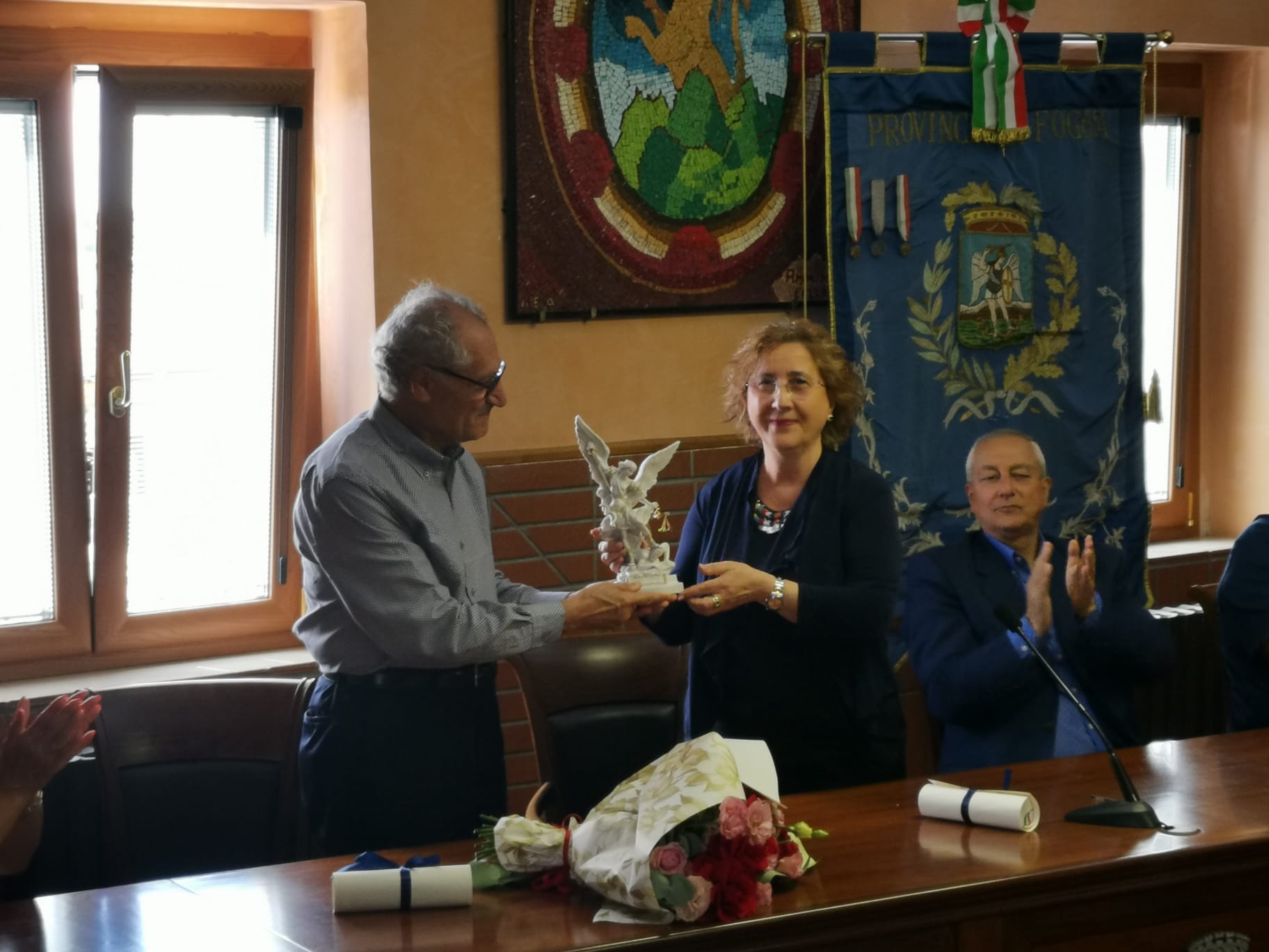 Nel corso dell’incontro la Vice Presidente Palladino ha consegnato una scultura Micaelica, simbolo della Provincia di Foggia, al Presidente dell’Associazione dei Monteleonesi di Toronto, Luigi Nunno.