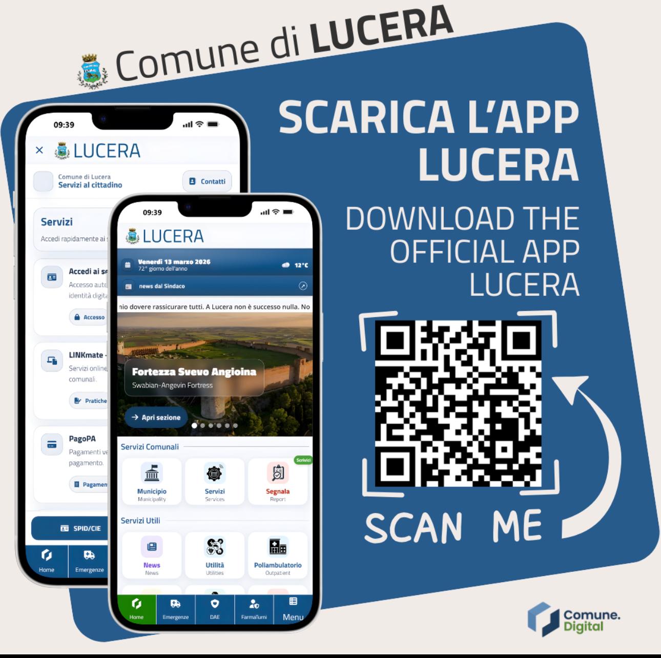 LUCERA – “Ci stavamo lavorando, ora è pronta e sarà utile anche per essere informati sulle emergenze causate dal maltempo: con la APP Lucera, scaricabile sia su Google Play che su Apple Store, tutti i cittadini potranno ricevere in tempo reale aggiornamenti su emergenze, viabilità e tutto ciò che riguarda la città”. È Giuseppe Pitta, attraverso una nota, ad annunciare l’attivazione di una nuova applicazione digitale. Si tratta della APP Lucera. Un ponte tra l’Amministrazione comunale e i cittadini per avere a disposizione una serie di servizi: direttamente dallo smartphone è già possibile richiedere certificati, prenotare appuntamenti, inviare segnalazioni, ricevere aggiornamenti su eventi, farmacie di turno, manifestazioni. “L’APP Lucera”, spiega Pitta, “è anche una guida turistica alla scoperta della città e del suo territorio: anfiteatro romano, fortezza svevo angioina, chiese, teatri, musei e punti di interesse sono geolocalizzati e possono essere scoperti con tour digitali che ne raccontano la storia, assieme alle tradizioni lucerine. L’App Lucera è un progetto vivo e in continua evoluzione che crescerà grazie ai vostri suggerimenti e alla vostra partecipazione”. L’applicazione può essere scaricata gratuitamente dagli store Apple e Android. “Utilizziamo tutti la sezione DÍ LA TUA, che dà la possibilità di inviare opinioni sul servizio e su come integrarlo ulteriormente. Costruiamo insieme una Lucera più smart, più connessa e certamente più vicina alle esigenze di tutti noi. Buona navigazione nella nostra Lucera”.