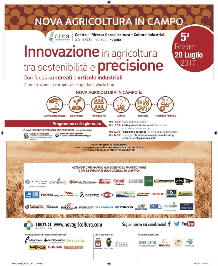 Il ministro dell’Agricoltura, Maurizio Martina, arriverà a Foggia giovedì 20 luglio 2017. Sarà nel capoluogo della Daunia per partecipare a “Nova Agricoltura in Campo”, l’iniziativa che si terrà dal mattino e per tutta la giornata nelle strutture del Centro di Ricerche per la Cerealicoltura, S.S. 673 Km 25,2. Si tratta della quinta edizione dell’evento, l’incontro più atteso dell’anno per la community di Nova Agricoltura che celebra la smart farm. Tema al centro del meeting di quest’anno, aperto alla partecipazione del pubblico, è l’agricoltura di precisione, con focus su cereali e orticole industriali, dimostrazioni in campo, visite guidate e workshop. L’iniziativa, che ha un programma ricco e articolato, prenderà il via alle 9 con la registrazione dei visitatori e seguirà alle 9.30 con la visita guidata ai cantieri di lavorazione e le dimostrazioni in campo. Alle 14.30, avrà inizio il convegno su “Innovazione e precision farming nell’era dell’Agricoltura 4.0”. Il convegno sarà aperto dai saluti istituzionali con gli interventi di: Franco Landella, sindaco di Foggia; Colomba Mongiello, parlamentare componente della Commissione Agricoltura; Maurizio Ricci, rettore dell’Università di Foggia.
