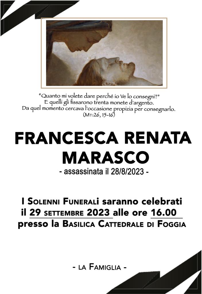 Si svolgeranno domani alle 16, i funerali di Franca Marasco la titolare della tabaccheria uccisa a coltellate nel corso di una rapina il 28 agosto scorso in via Marchese de Rosa a Foggia. Ieri si è svolta l’autopsia sul corpo della vittima e domani, ad un mese dal delitto, si svolgeranno i funerali che saranno celebrati nella cattedrale della città, officiati dal vescovo Monsignor Vincenzo Pelvi. Come disposto dalla commissione prefettizia domani a Foggia sarà lutto cittadino. Ad uccidere la tabaccaia è stato un cittadino marocchino nel tentativo di una rapina. Arrestato anche