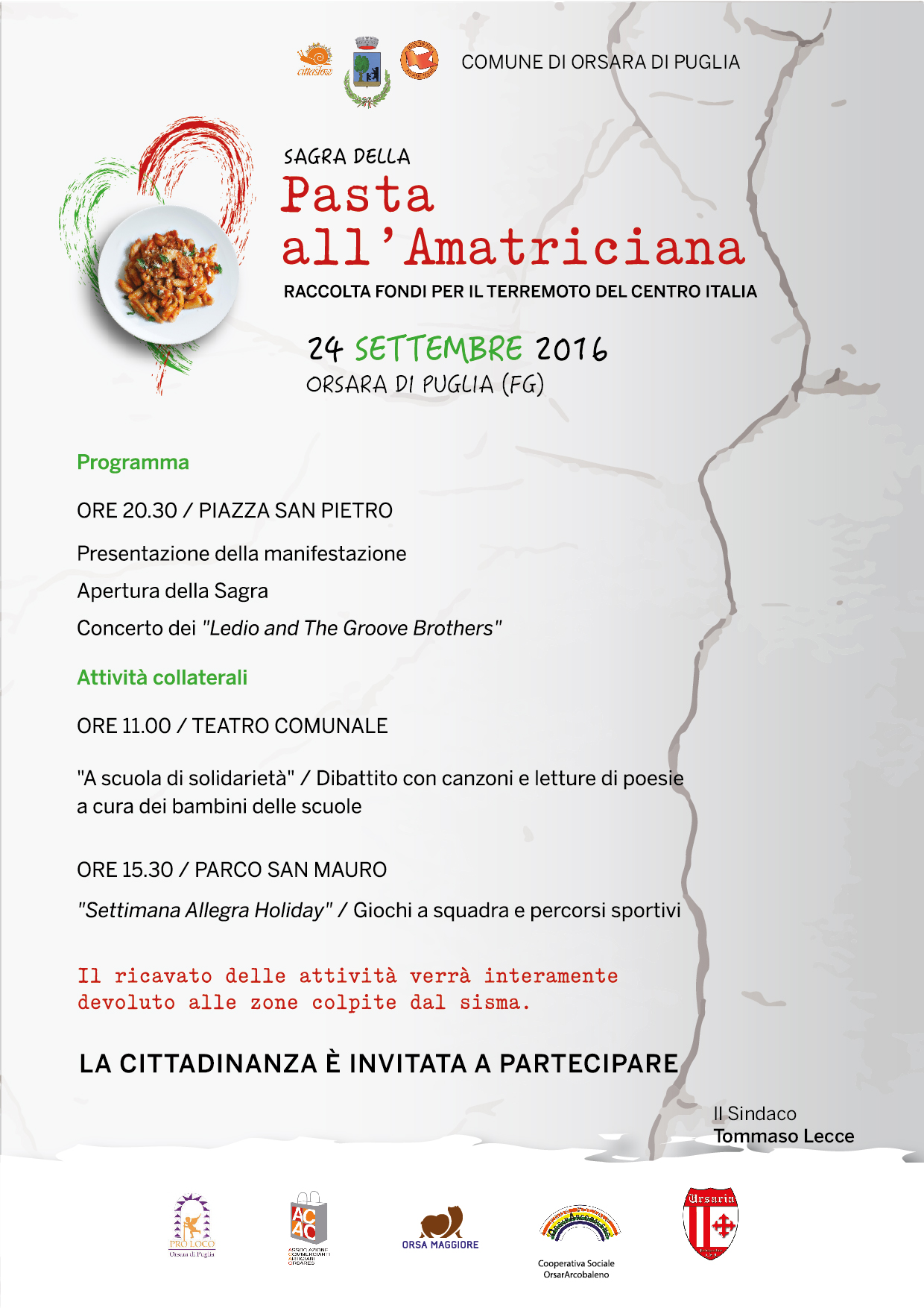 Sabato 24 settembre, a Orsara di Puglia si terrà la Sagra della Pasta all’Amatriciana. Il ricavato della manifestazione sarà interamente devoluto in beneficienza per alleviare i disagi che le famiglie colpite dal terremoto stanno vivendo. La giornata comincerà alle ore 11, al Teatro Comunale, con il dibattito “A scuola di solidarietà”: i bambini delle scuole si cimenteranno cantando e leggendo poesie. Alle 15.30, la giornata proseguirà all’interno del Parco San Mauro con “Settimana Allegra Holiday”, gare di giochi a squadre e percorsi sportivi. Alle 20.30, in Piazza San Pietro, si darà il via alla Sagra della Pasta all’Amatriciana e si terrà il concerto dei Ledio and The Groove Brothers. In serata, le compagnie teatrali di Orsara e l’associazione Orsa Maggiore coinvolgeranno i bambini in recite, poesie, canti e giochi di animazione. L’iniziativa, organizzata dal Comune di Orsara di Puglia, è stata ideata e sarà realizzata grazie alla collaborazione di Pro Loco, Istituto Scolastico Comprensivo “Virgilio”, Cooperativa Orsara Arcobaleno, Colpo in Canna, Orsa Maggiore, Acao Associazione Commercianti e Artigiani Orsaresi, Polisportiva Ursaria, compagnia teatrale Arti e Mestieri, compagnia teatrale Senza Nome. “Ancora una volta, col terremoto di un mese fa, è stata colpita con tragica durezza la spina dorsale del Paese, l’Italia dei borghi dell’entroterra, quella che ancora conserva, tutela e valorizza il grande patrimonio italiano rappresentato dalla cultura contadina e da valori senza tempo”, ha dichiarato il sindaco di Orsara di Puglia, Tommaso Lecce. “L’iniziativa del 24 settembre vuole essere il nostro modo di manifestare la vicinanza della Comunità orsarese ai paesi colpiti dal sisma”. Alle parole del primo cittadino si aggiungono quelle del vicesindaco Rocco Dedda, assessore con delega alla Cultura e ai Giovani: “Il collante tra Comune, scuola e associazioni è molto importante, perché ci permette di organizzare un’iniziativa che sensibilizza e fa formazione su temi di grande rilievo come la solidarietà e la prevenzione del rischio sismico, provando a fornire un aiuto concreto a chi sta lottando per ricostruire la propria vita”.