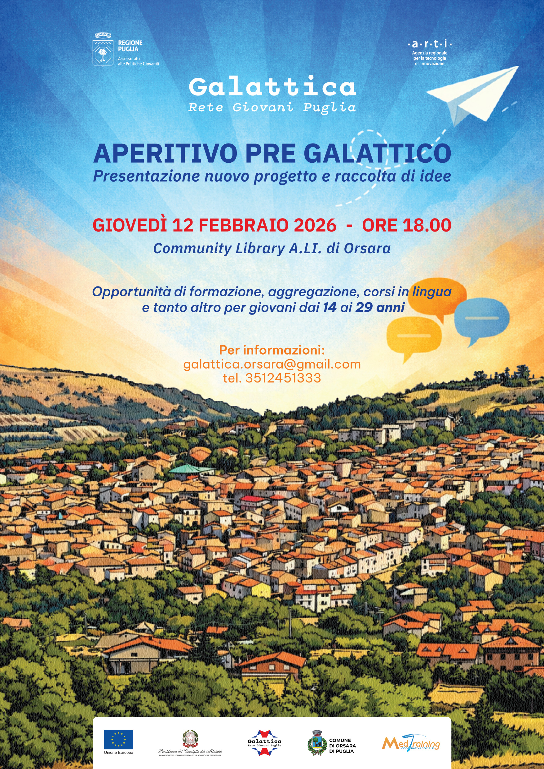Un Aperitivo Pre-Galattico per presentare il nuovo progetto e raccogliere le idee dei più giovani che possono contribuire a creare opportunità di sviluppo e di lavoro nella loro comunità. Giovedì 12 febbraio 2026 ad Orsara di Puglia, alle ore 18.00, negli spazi della Community Library “A.LI.” (Largo San Michele) si svolgerà il processo partecipativo del progetto “Galattica Orsara”, promosso dal Comune di Orsara di Puglia in qualità di ente capofila e gestito dalla cooperativa sociale Medtraining. Opportunità di formazione, aggregazione, corsi in lingua e tanto altro per giovani dai 14 ai 29 anni che hanno voglia di mettersi in gioco e di scommettere sul loro territorio.