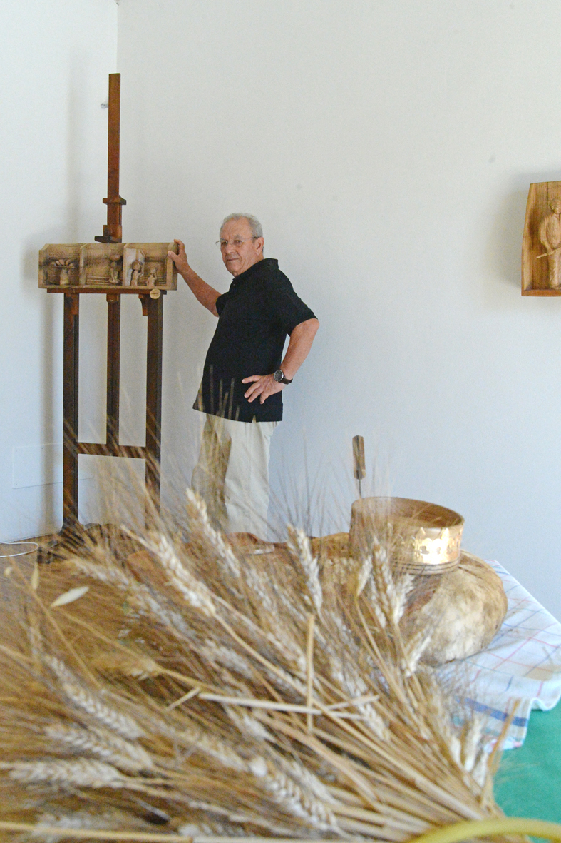 La sua passione per la scultura ha radici nella terra argillosa di certe aree di Orsara. Antonio Poppa ha coltivato quella passione come fosse un campo di grano. Sulla sua strada, ha incontrato il maestro Giuseppe Binel, esponente di primo piano della scultura valdostana che l’ha sostenuto in questo lavoro. LA VIA DEL PANE. Prima di arrivare alla tavola, il pane, o almeno quello di un tempo, era ed è aratura, poi semina, mietitura, metafora della fatica e della gioia di vivere. Si passa dai campi, camminando a fatica tra le zolle, per poi arrivare al mulino, trasformare i chicchi in oro. L’ultimo passaggio, prima della tavola, è in forno. La mostra di Antonio Poppa disegna la mappa del pane, andando a raccogliere i rilievi della memoria per trasformarli in scultura. Un’opera d’arte fissa per sempre una storia, un percorso, interi volumi di valori e significati. E’ così che “La via del Pane” racconta, con il meccanismo dello specchio che non riflette più la realtà, il cambiamento, lo sviluppo industriale, l’effetto straniante della meccanizzazione e dei riti che diventano rarità. Antonio Poppa, all’Olivetti, ha vissuto quel passaggio in modo diretto, partecipando in prima persona allo sviluppo dell’informatica e l’avvento della robotica. Per questo il suo omaggio al pane è tutt’altro che nostalgico (anche se evoca e provoca nostalgia), caratterizzandosi piuttosto come un omaggio tenero e consapevole alla grande cultura del pane. Attrezzi, luoghi e persone sono memorizzati con tenerezza e religioso rispetto.