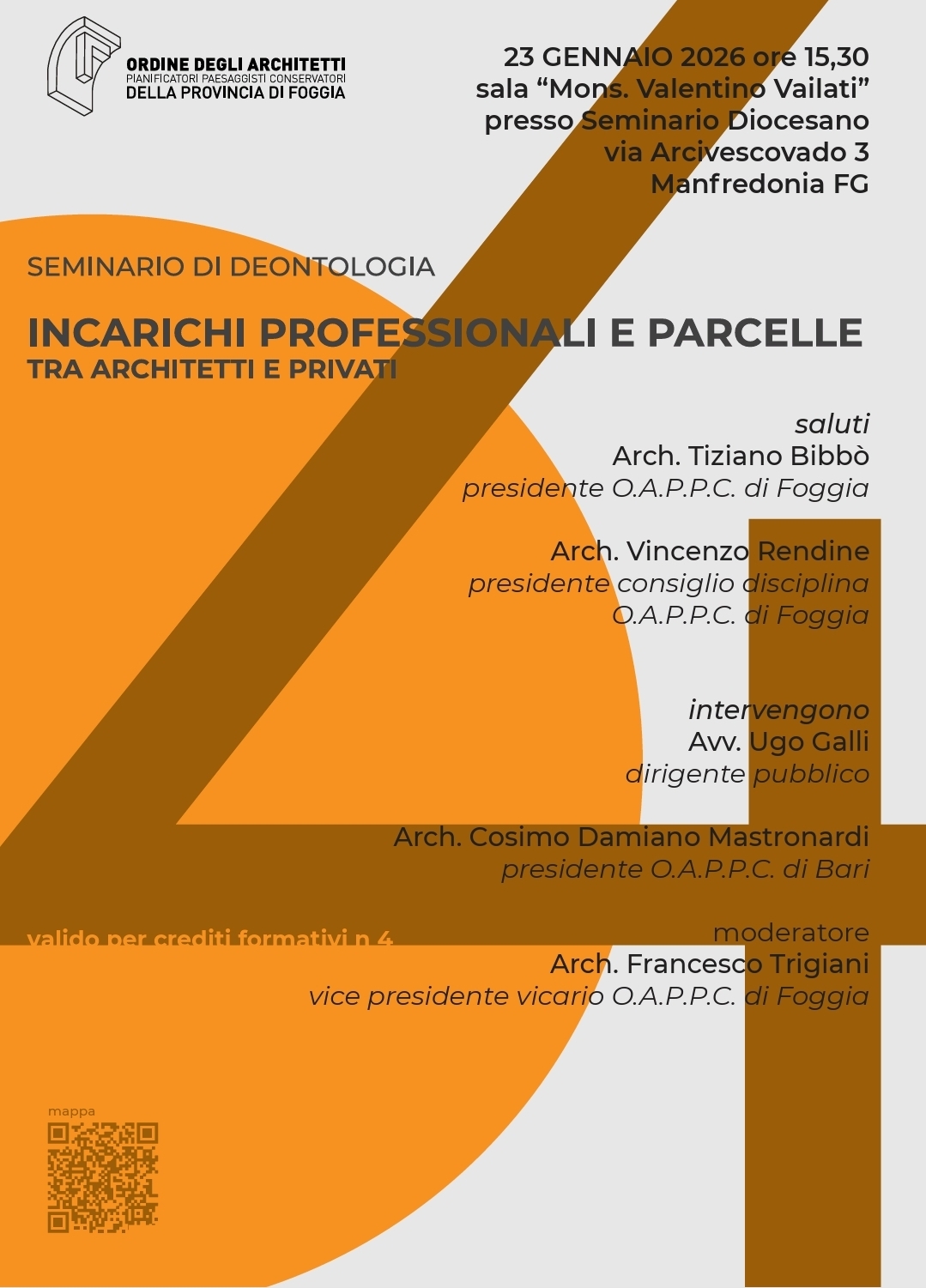 Si parlerà di “Incarichi professionali e parcelle” tra architetti e privati, un tema di grande attualità che l’Ordine degli Architetti, Paesaggisti e Pianificatori della provincia di Foggia ha voluto mettere al centro di un seminario, che avrà anche un valore di 4 crediti formativi per gli architetti. L’incontro sarà aperto dai saluti di Tiziano Bibbò (presidente dell’Ordine degli Architetti di Foggia) e da Vincenzo Rendine (presidente del Consiglio di disciplina dell’Ordine degli Architetti di Foggia).