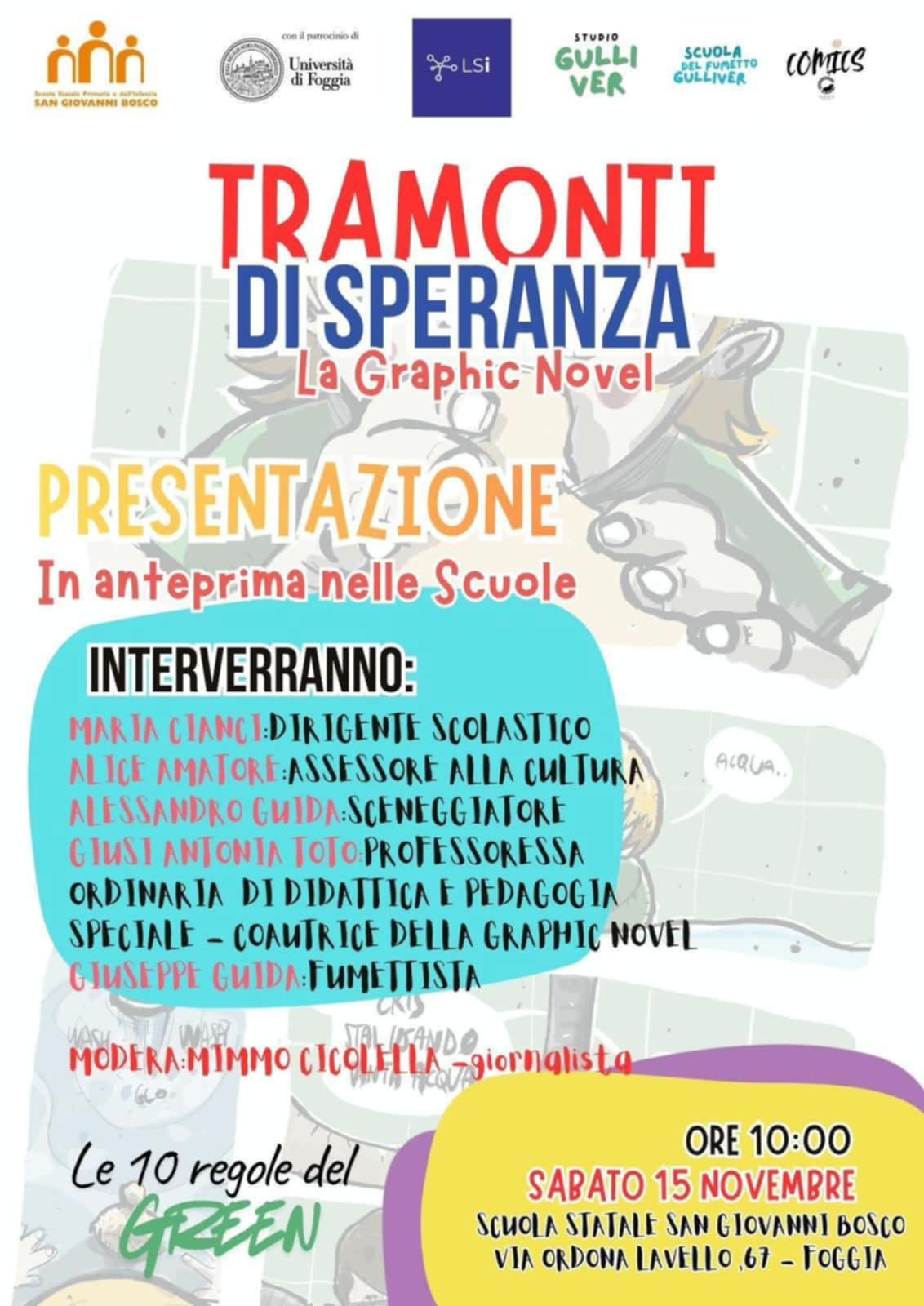 Sabato 15 novembre prenderà il via, presso la Direzione Didattica “San Giovanni Bosco” di Foggia, il tour di presentazione nelle scuole della graphic novel “Tramonti di speranza”, un progetto che intreccia arte, educazione e riflessione sociale attraverso il linguaggio del fumetto.