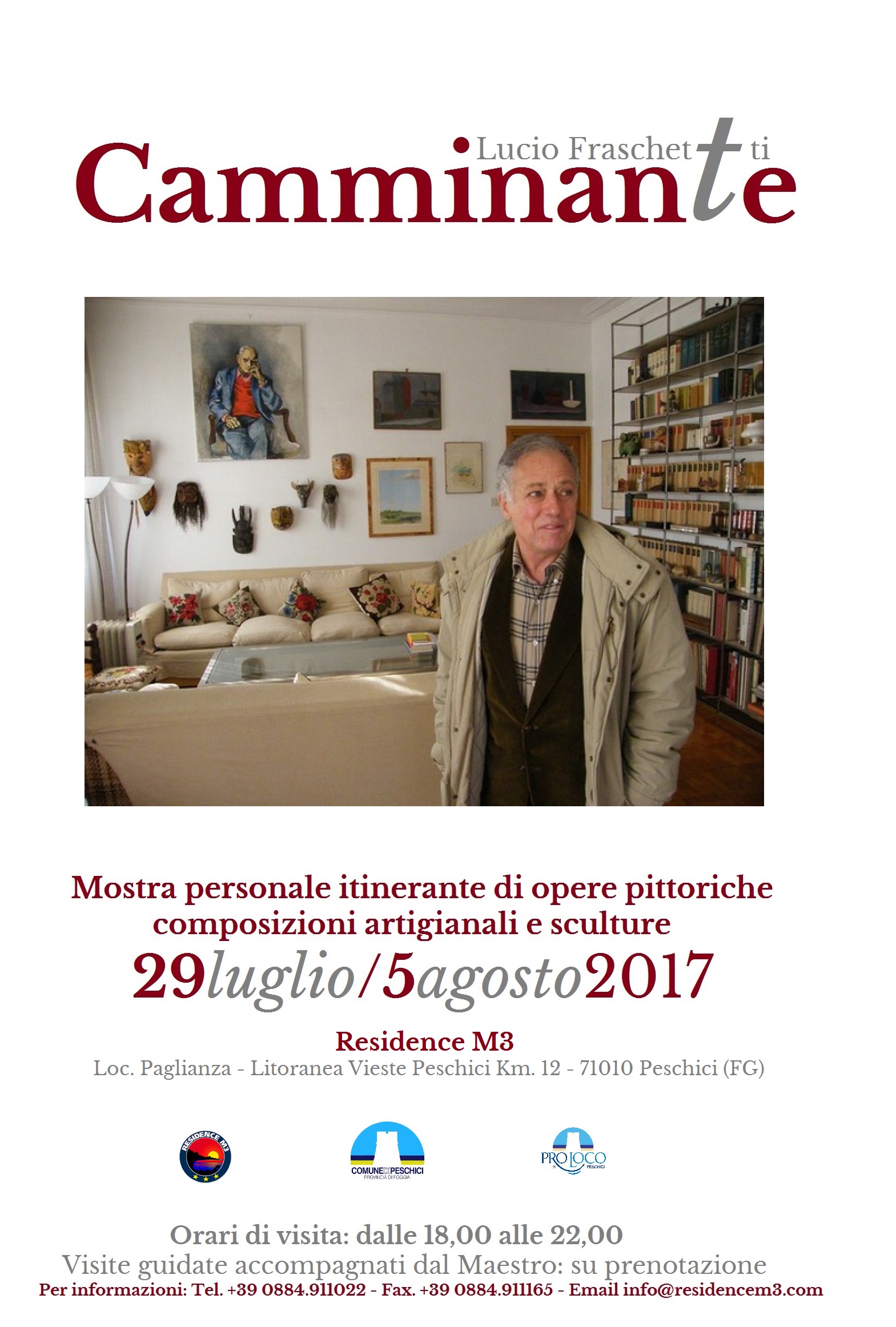 Organizzata dal Residence M3, con il patrocinio del Comune e della Pro Loco di Peschici, dal 29 luglio al 5 agosto p.v. proprio all’interno del Residence M3 si terrà la mostra personale dell’artista romano Lucio Fraschetti dal titolo Camminante (tratto dalla poesia di Antonio Machado). Opere pittoriche, composizioni artigianali, bozzetti, esperimenti e sculture realizzate in oltre quarant’anni di attività artistica, durante cui Lucio Fraschetti – a lungo dipendente di quella che fu la “grande Alitalia”, esperienza personale e professionale che gli ha permesso di girare per il mondo – si è messo in evidenza soprattutto per il tratto rigorosamente artigianale delle sue composizioni. Legno, ferro, marmo, pietra, travertino vengono trattati da Fraschetti con la stessa naturale manualità, una dimestichezza che gli ha permesso anche di cimentarsi con la “pietra di Apricena” realizzando busti e rivisitazioni ispirati o direttamente influenzati dall’arte scultorea degli antichi Greci e Romani.