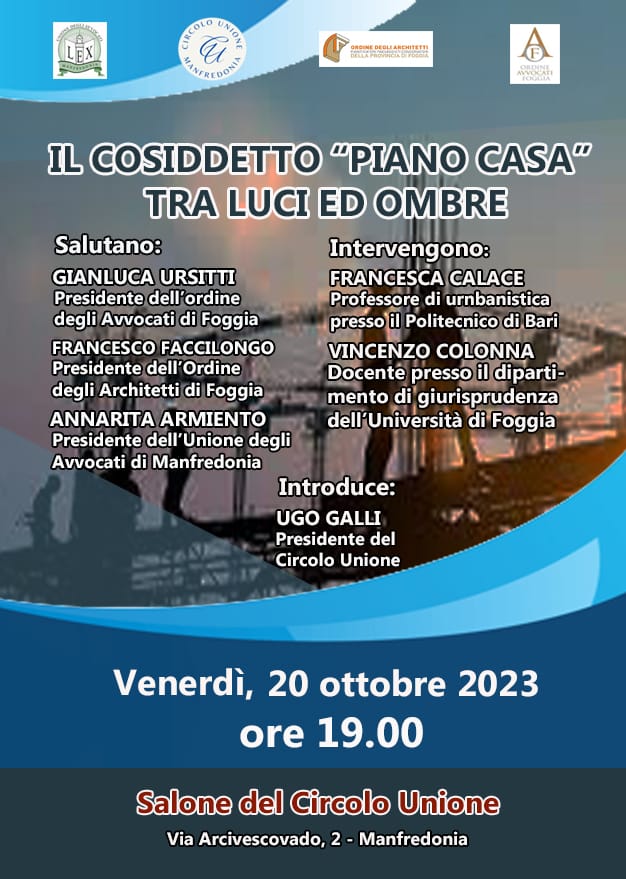 Le descritte problematiche saranno affrontate venerdì 20 ottobre, alle ore 19.00, presso la sede del Circolo Unione, da Francesca Calace, professoressa di Urbanistica presso il Politecnico di Bari e da Enzo Colonna, docente del Dipartimento di Giurisprudenza dell’Università di Foggia.