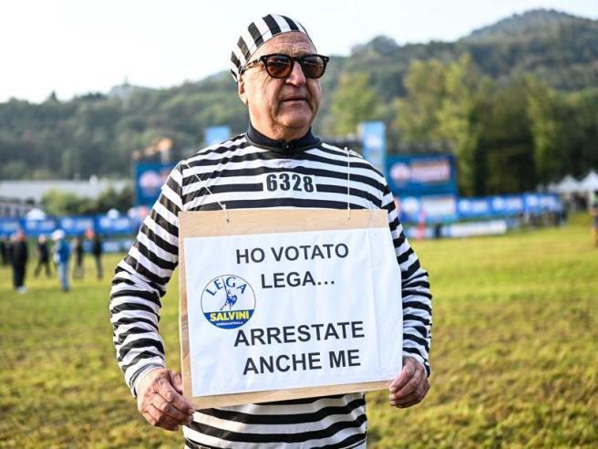PONTIDA – In segno di solidarietà e vicinanza al leader della Lega Matteo Salvini il vicesindaco di Serracapriola Michele Leombruno si è presentato in divisa a righe da carcerato sul prato di Pontida con al collo un cartello: «Ho votato Lega… Arrestate anche me». Leombruno, 63 anni, è un poliziotto in pensione, ed ha aderito alla Lega nel 2015.