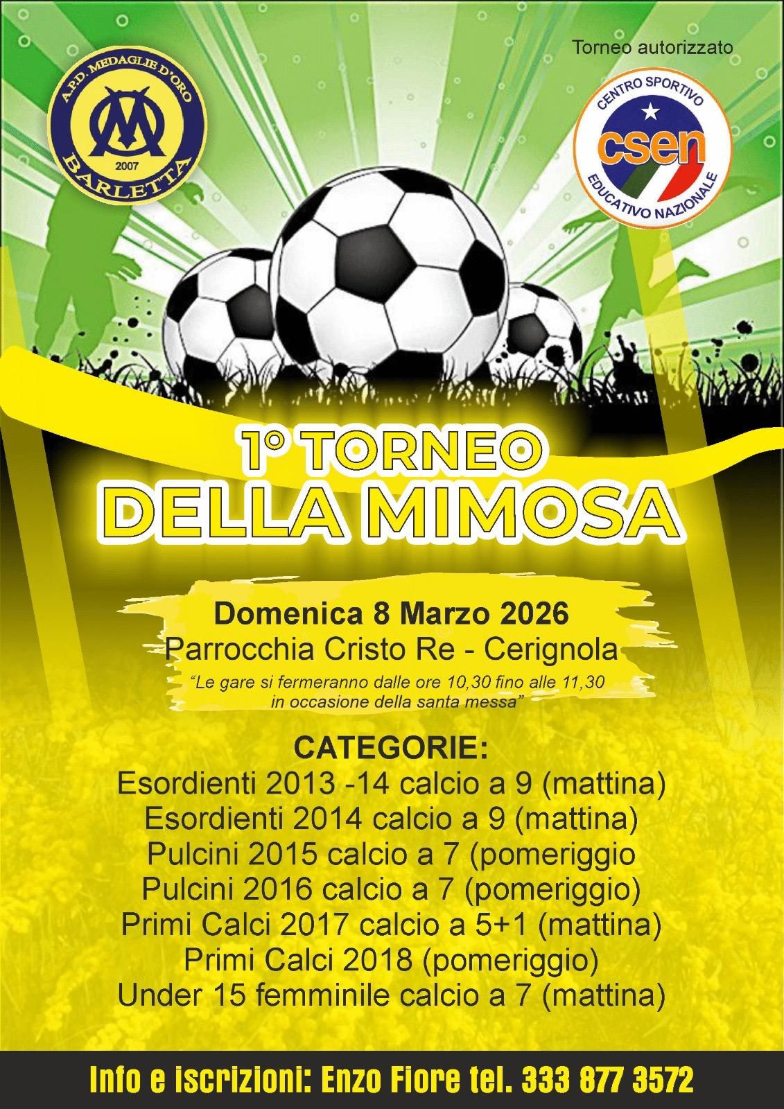 Organizzato da ASD “Medaglie d’oro” Barletta, ASD Soccer Academy (coordinatore Giuseppe Mennuni), con la collaborazione di Audace Academy Scuola Calcio, il torneo autorizzato CSEN (Centro Sportivo Educativo Nazionale) si svolgerà presso la Parrocchia Cristo Re e Oratorio Salesiano “Don Bosco” di Cerignola.