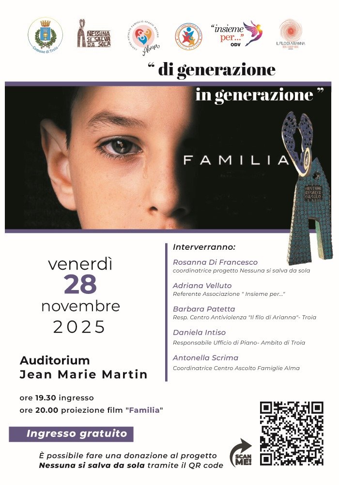La proiezione speciale è in programma venerdì 28 novembre alle 19.30 a Troia presso l’Auditorium Jean Marie Martin e rientra nel progetto “Nessuna si salva da sola”, che vede come capofila l’associazione Insieme per…, con la partnership di Il filo di Arianna, UGT Unione Giovanile Troiana, Comune di Troia, Ambito sociale di Troia, Centro di Ascolto e per famiglie “Alma”, Università degli Studi di Foggia, Teatri 35, UGT, Fondazione Tina Lagostena Bassi di Roma.