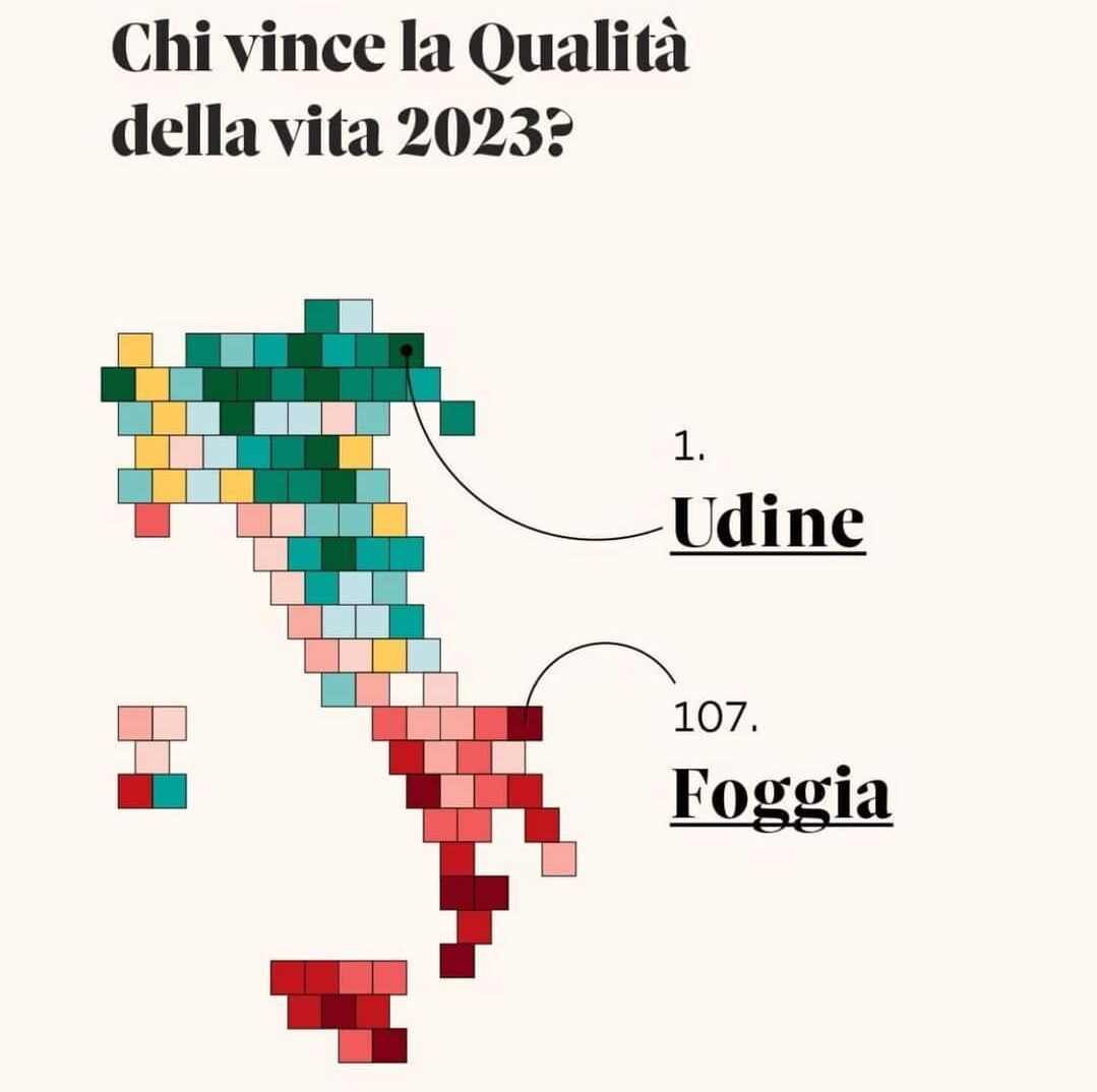 Lo scorso anno Foggia occupava la terzultima posizione nella annuale classifica della qualità della vita stilata dal Sole 24 ore. Quest’anno Foggia precipita all’ultima posizione, la 107. Male tutte le province pugliesi. La prima è Bari, che occupa la 69′ posizione in classifica.