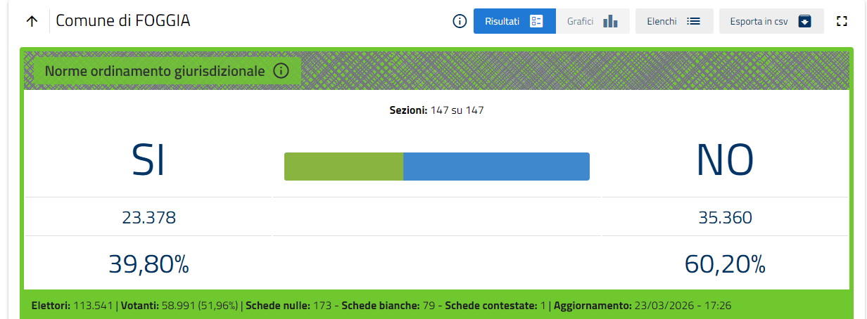 FOGGIA – Foggia città supera in percentuale il voto regionale e nazionale. Oltre il 60% degli elettori del capoluogo ha infatti votato NO. Il voto nelle 147 sezioni ha premiato gli oppositori alla riforma Nordio con il 60.20%, contro il 39.30% dei sostenitori del SI.