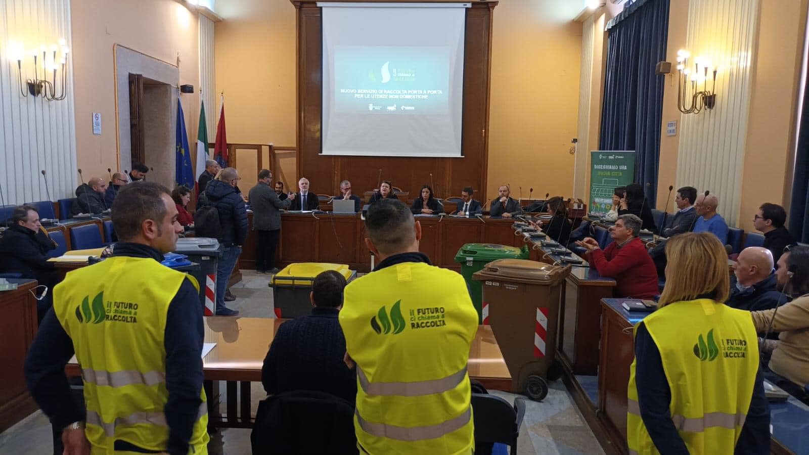 Oggi nell’aula consiliare del nostro Comune si è svolta la conferenza stampa di presentazione del Nuovo Servizio di Raccolta Porta a Porta dei Rifiuti per le utenze non domestiche.