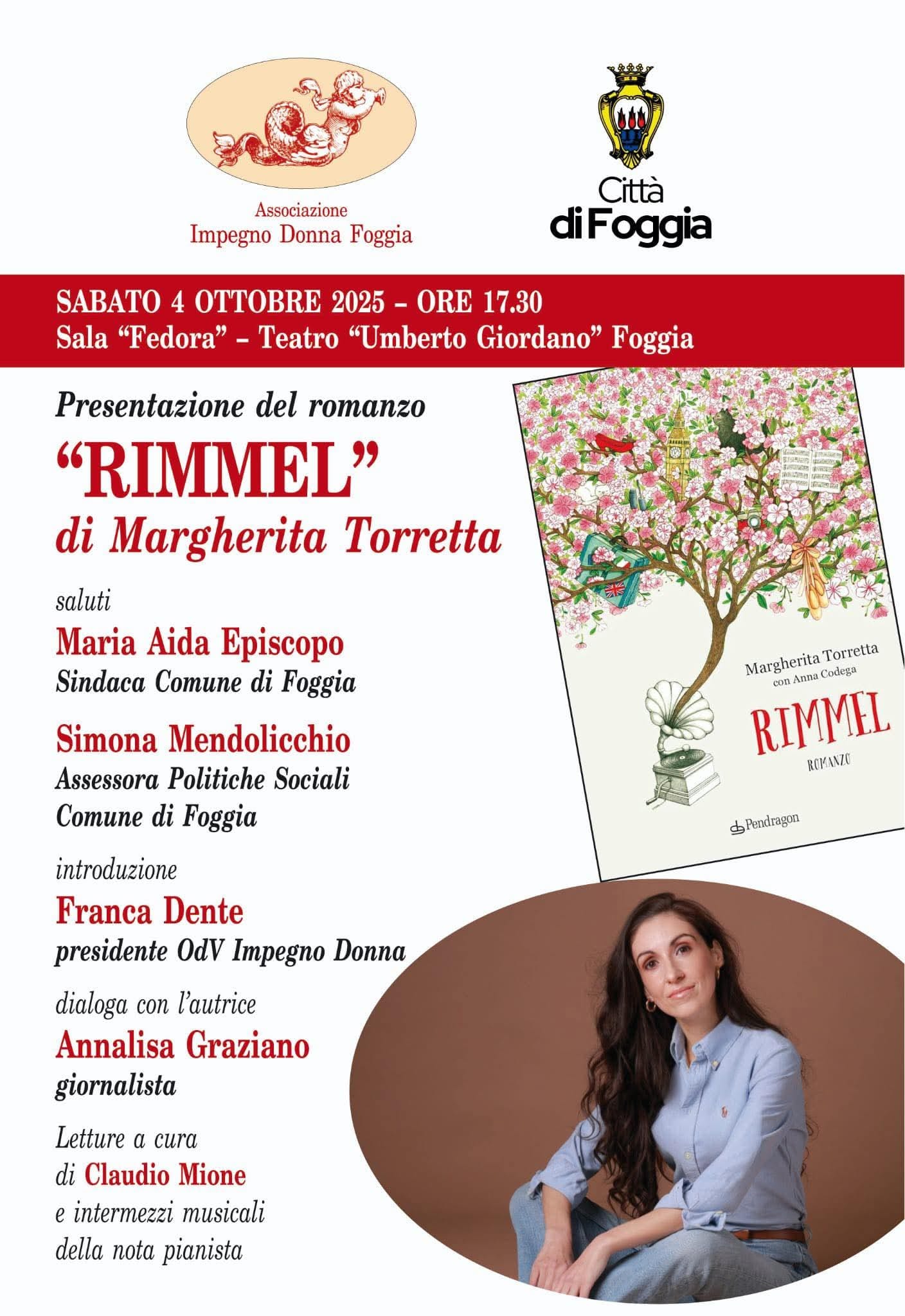 La nota pianista Margherita Torretta sarà ospite del Comune di Foggia e dell’associazione Impegno Donna per presentare il suo romanzo “Rimmel” (edito da Pendragon), scritto con Anna Codega. L’appuntamento è per domani, sabato 4 ottobre prossimo, alle ore 17.30, nella Sala ‘Fedora’ del Teatro Umberto Giordano.