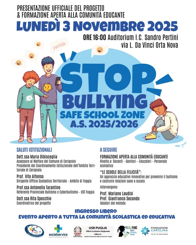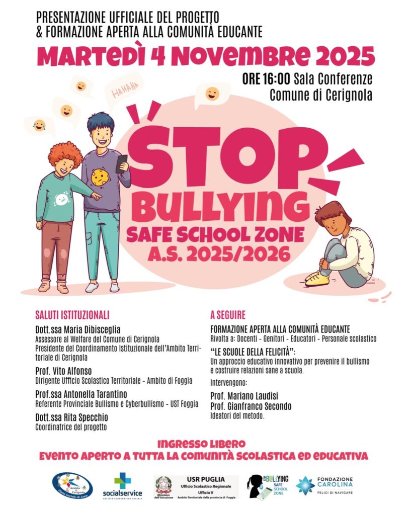 Promuovere benessere scolastico, educazione digitale e prevenzione del bullismo e cyberbullismo, offrendo ad alunni ed alunne un percorso integrato che unisce educazione emotiva, coaching e competenze digitali. Sono queste le finalità con cui riparte l’edizione 2025-2026 del progetto “StopBullying – Safe School Zone”, a cura dell’equipe socio-psico-pedagogica della cooperativa SocialService, che coinvolge le scuole dell’Ambito Territoriale di Cerignola che hanno aderito alla proposta progettuale. Lunedì 3 novembre 2025 ad Orta Nova e martedì 4 novembre a Cerignola, infatti, si svolgeranno due momenti dedicati alla presentazione ufficiale del progetto e alla formazione aperta alla comunità educante, rivolta a docenti, genitori, educatori e personale scolastico. Tema dell’incontro: “Le scuole della felicità”, un approccio educativo e innovativo per prevenire il bullismo e costruire relazioni sane a scuola.