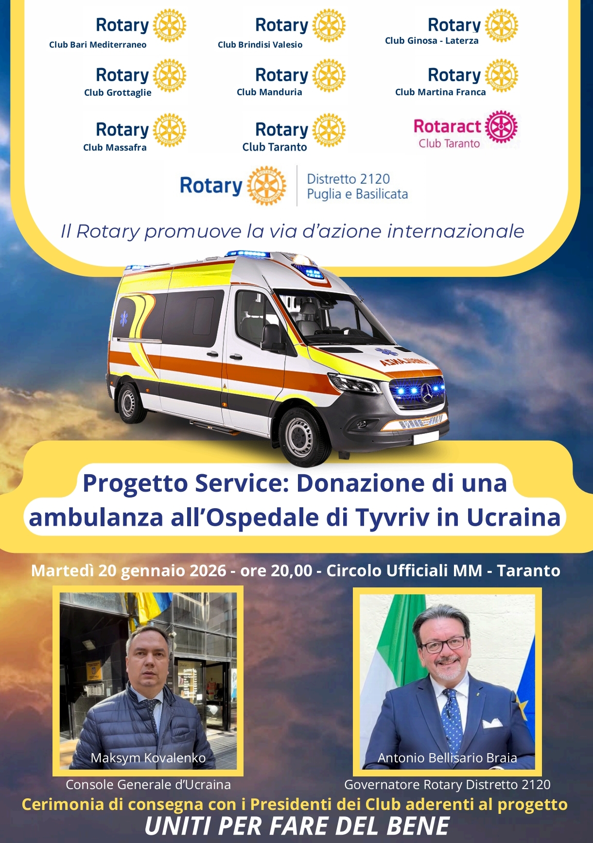 La cerimonia di consegna è prevista per martedì 20 gennaio alle 20 al Circolo Ufficiali della Marina Militare di Taranto, dove il console generale d’Ucraina, Maksym Kovalenko, riceverà le chiavi del mezzo medico dalle mani del Governatore del Rotary International Distretto Rotary 2120, Antonio Braia, affiancato dai presidenti dei club promotori. Un progetto/service che ha visto portare a valore il capitale umano rotariano e le relative competenze, conoscenze e connessioni, nella via di azione internazionale del Rotary, rispondendo ai bisogni delle comunità.