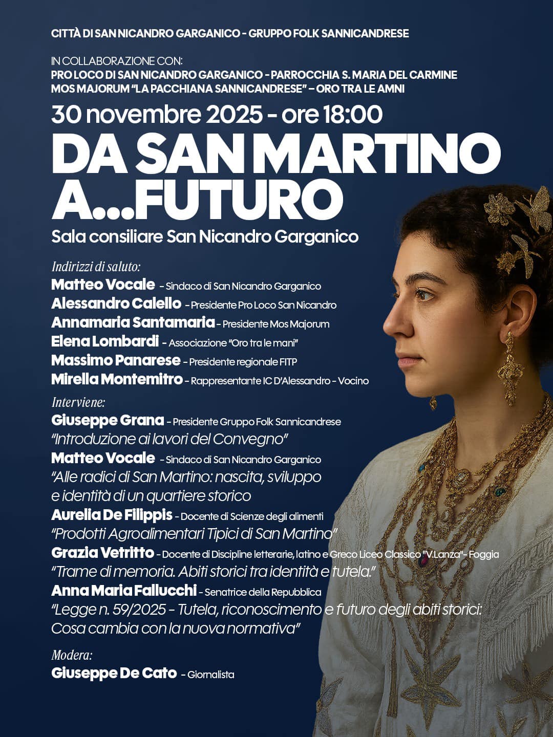 Abiti storici tra identità e tutela». Attraverso un excursus storico e antropologico, analizzerà il valore culturale e simbolico degli abiti, dall’antica Grecia fino ai giorni nostri, con particolare attenzione al costume tradizionale di San Nicandro Garganico, mettendone in luce il ruolo nella costruzione dell’identità collettiva, nella trasmissione della memoria locale e nell’importanza della loro valorizzazione e tutela.