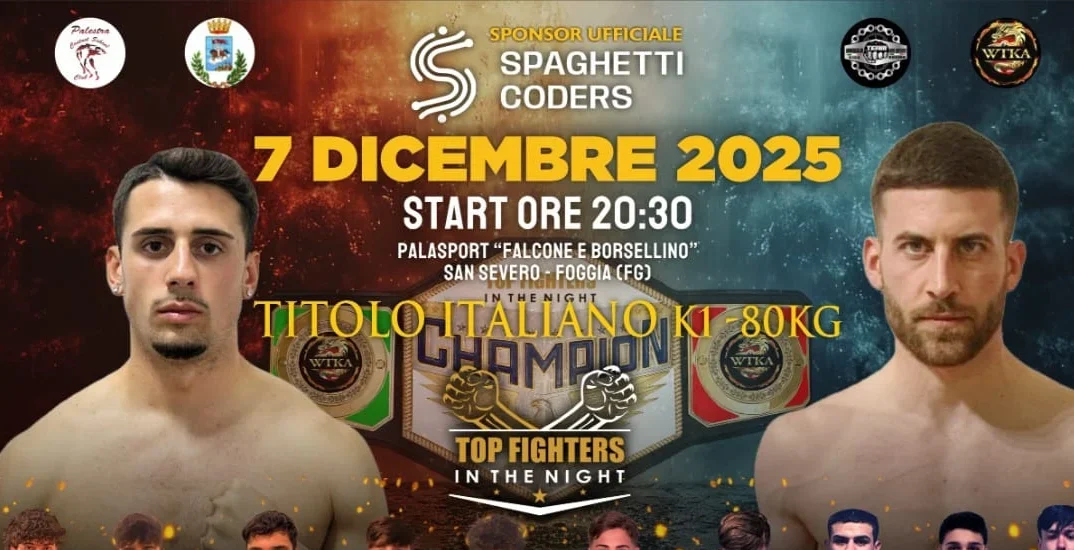 SAN SEVERO – Grande serata di kickboxing in programma domenica 7 dicembre 2025 presso il Palasport Falcone e Borsellino di Viale Castellana a partire dalle ore 19:00. E’ previsto, infatti, il combattimento per il titolo Italiano WTKA semi pro pesi massimi leggeri tra il sanseverese Paolo Capanna (20 anni) e lo sfidante Francesco Selce (30 anni) di Lecce.
