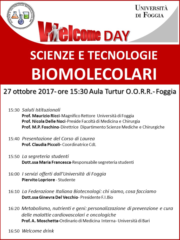 Dopo i saluti istituzionali – affidati nell’ordine al Rettore dell’Università di Foggia, prof. Maurizio Ricci; al preside della Facoltà di Medicina, prof. Nicola Delle Noci; alla direttrice del Dipartimento di Scienze mediche e chirurgiche, prof.ssa Maria Pia Foschino; alla coordinatrice scientifica del corso di laurea, prof.ssa Claudia Piccoli; e alla responsabile della segreteria degli studenti, dott.ssa Maria Francesca – sarà uno studente, Piervito Lopriore, a illustrare ai suoi nuovi colleghi i serviti offerti dall’Università di Foggia. Previsto anche il prestigioso intervento della presidentessa della Federazione italiana biotecnologi (sul tema “Chi siamo, cosa facciamo”) dott.ssa Ginevra Del Vecchio, quindi la chiusura della prof. Antonio Moschetta (ordinario di Medicina interna all’Università di Bari, ricercatore molto conosciuto e apprezzato in Italia e all’estero soprattutto per i suoipreziosi contributi scientifici) sul tema “Metabolismo, nutrienti e geni: personalizzazione di prevenzione e cura delle malattie cardiovascolari e oncologiche”.