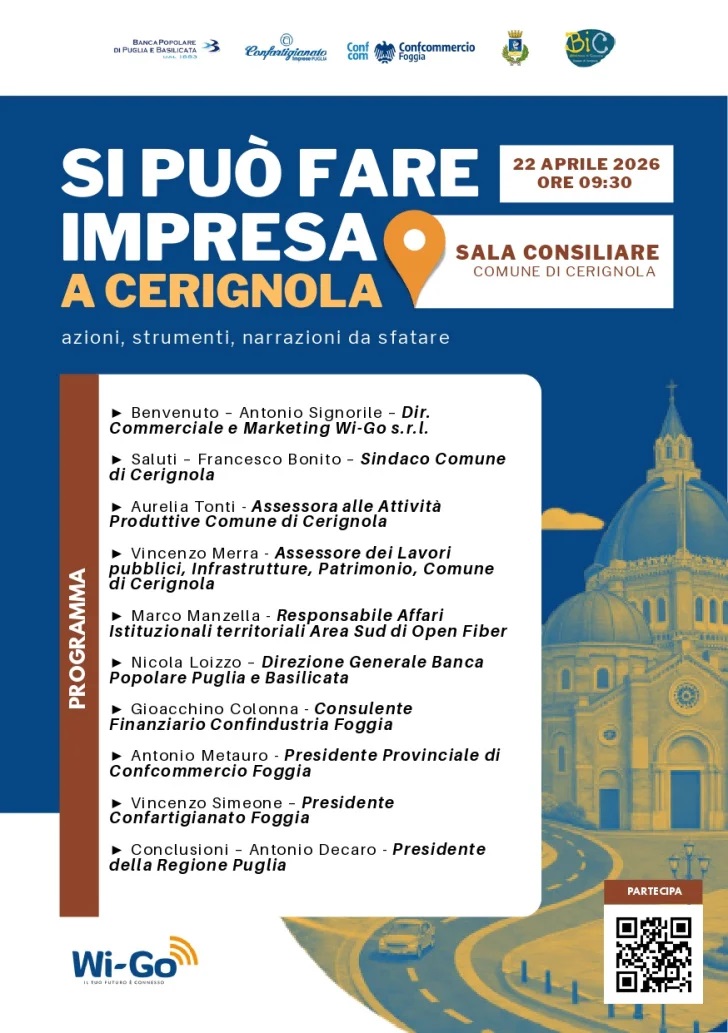 Mercoledì 22 Aprile dalle ore 10:00 alle 13:00 presso la Sala Consiliare del Comune di Cerignola si terrà il convegno “Si può fare impresa a Cerignola – azioni, strumenti, narrazioni da sfatare”, organizzato dalla Wi-Go srl, provider nel settore delle comunicazioni, internet e video sorveglianza.