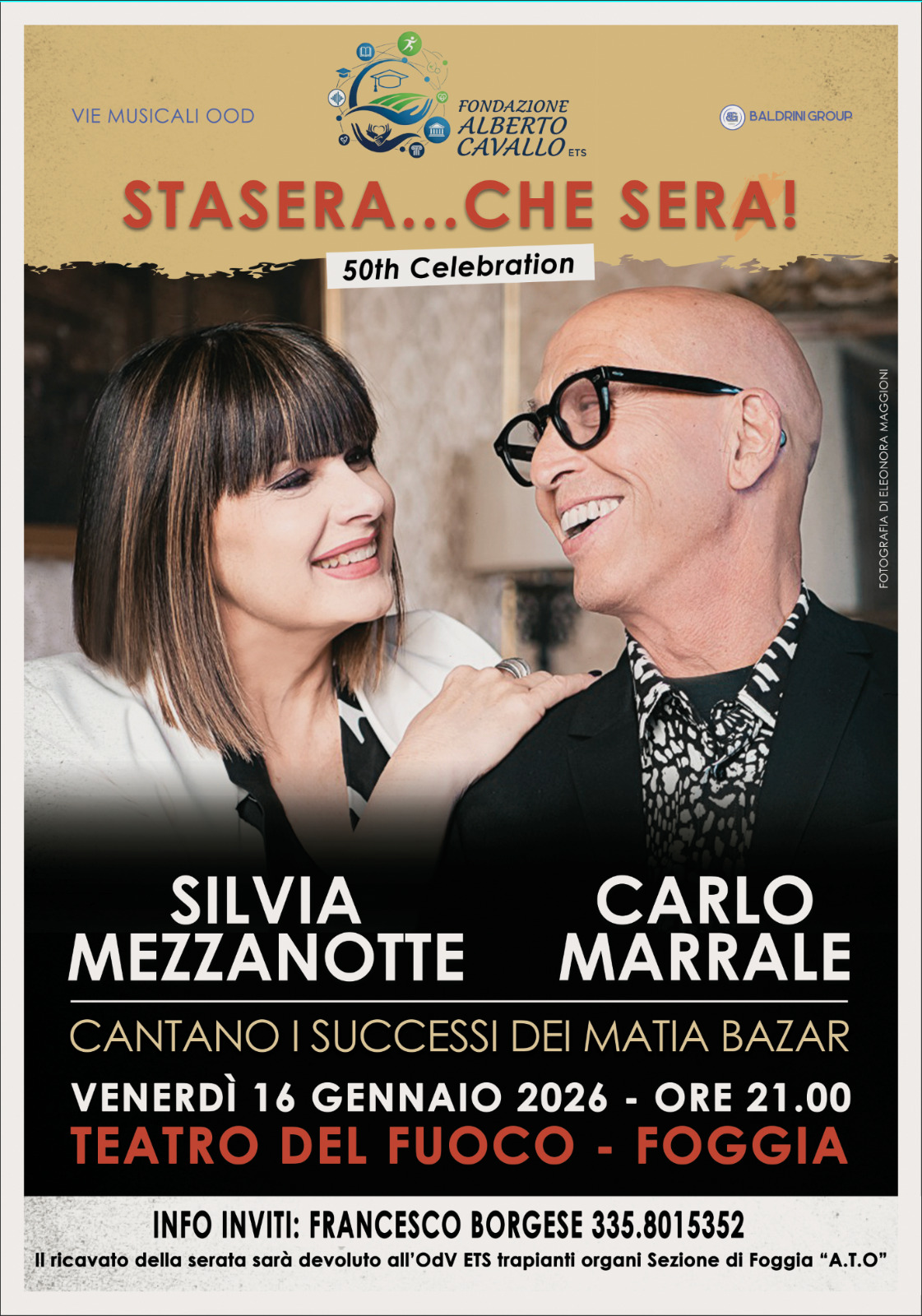 ๐๐ข๐๐๐๐ โ Con โStasera che Seraโ, la celebrazione dei primi 50 anni del brano che diede vita al celebre gruppo dei Matia Bazar, si apre il sipario sul primo evento solidale organizzato dalla Fondazione Alberto Cavallo ETS. Grazie ad una bella collaborazione con Vio Musicali OODe Baldrini Group, venerdรฌ 16 Gennaio 2026, alle 21 al Teatro del Fuoco di Foggia, la Fondazione Cavallo organizza questo viaggio emozionante attraverso la storia della musica italiana, per celebrare in particolare i successi di uno dei gruppi piรน iconici, i Matia Bazar. A rendere omaggio a queste indimenticabili melodie saranno due eccezionali artisti, Silvia Mezzanotte, storica e potente voce dei Matia Bazar e Carlo Marrale, fondatore e autore di molti dei brani piรน celebri della band.