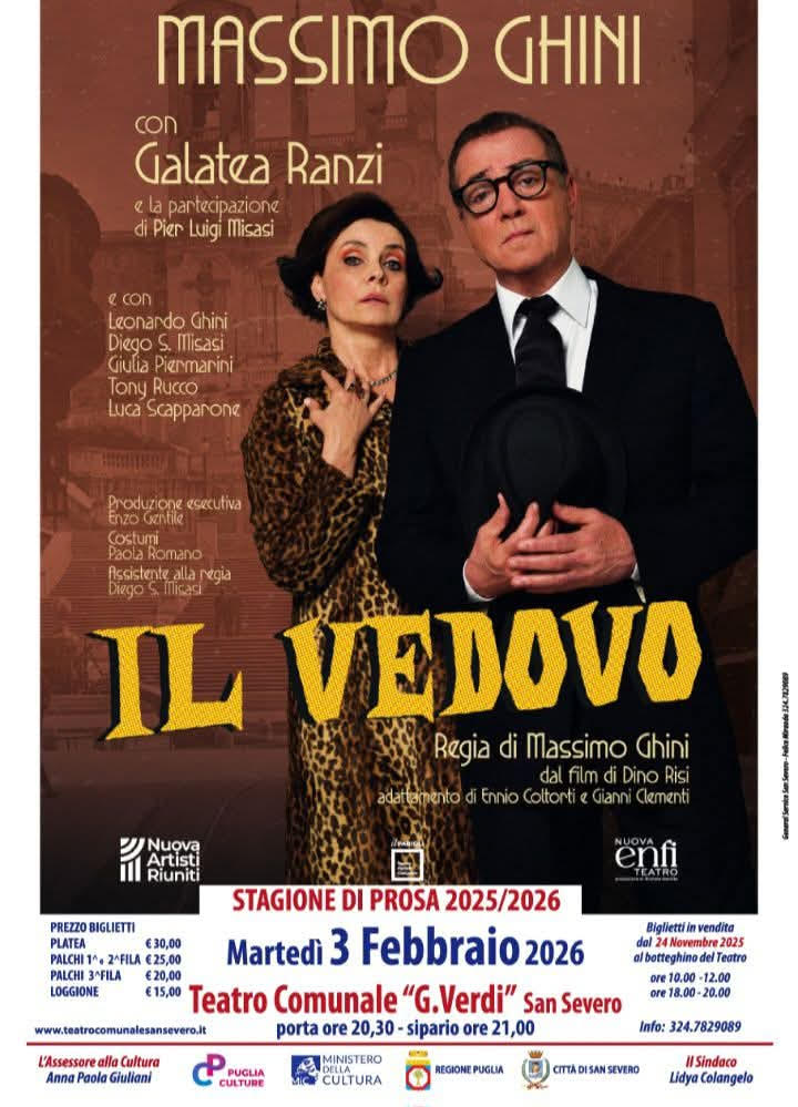 Martedì 3 febbraio 2026 al Teatro Comunale Giuseppe Verdi (porta ore 20,30, sipario ore 21,00) Massimo Ghini, Galatea Ranzi in IL VEDOVO dal film di Dino Risi, adattamento Ennio Coltorti e Gianni Clementi, e la partecipazione di Pier Luigi Misasi e con Leonardo Ghini, Diego Sebastian Misasi, Giulia Piermarini, Tony Rucco, Luca Scapparone, regia Massimo Ghini.