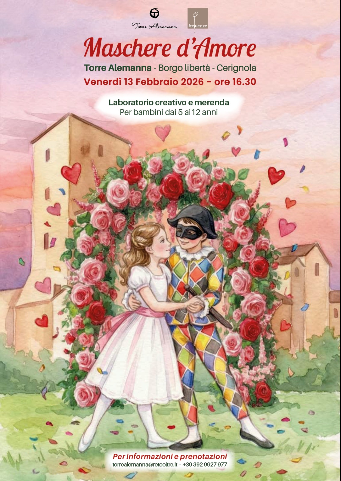 Nel periodo più colorato e giocoso dell’anno, tra coriandoli e cuori, Carnevale e San Valentino si incontrano. Nasce così a Torre Alemanna “Maschere d’Amore”, un laboratorio creativo tra sorrisi e immaginazione dedicato ai più piccoli tra i 5 e i 12 anni. L’iniziativa si svolgerà presso il Complesso Museale di Torre Alemanna sito a Borgo Libertà (Cerignola) venerdì 13 febbraio 2026, a partire dalle ore 16.30 con attività dedicate ai più piccoli che vogliono visitare, esplorare e conoscere uno tra i pochi insediamenti fortificati dell’Ordine dei Cavalieri Teutonici ancora esistente nell’area mediterranea.