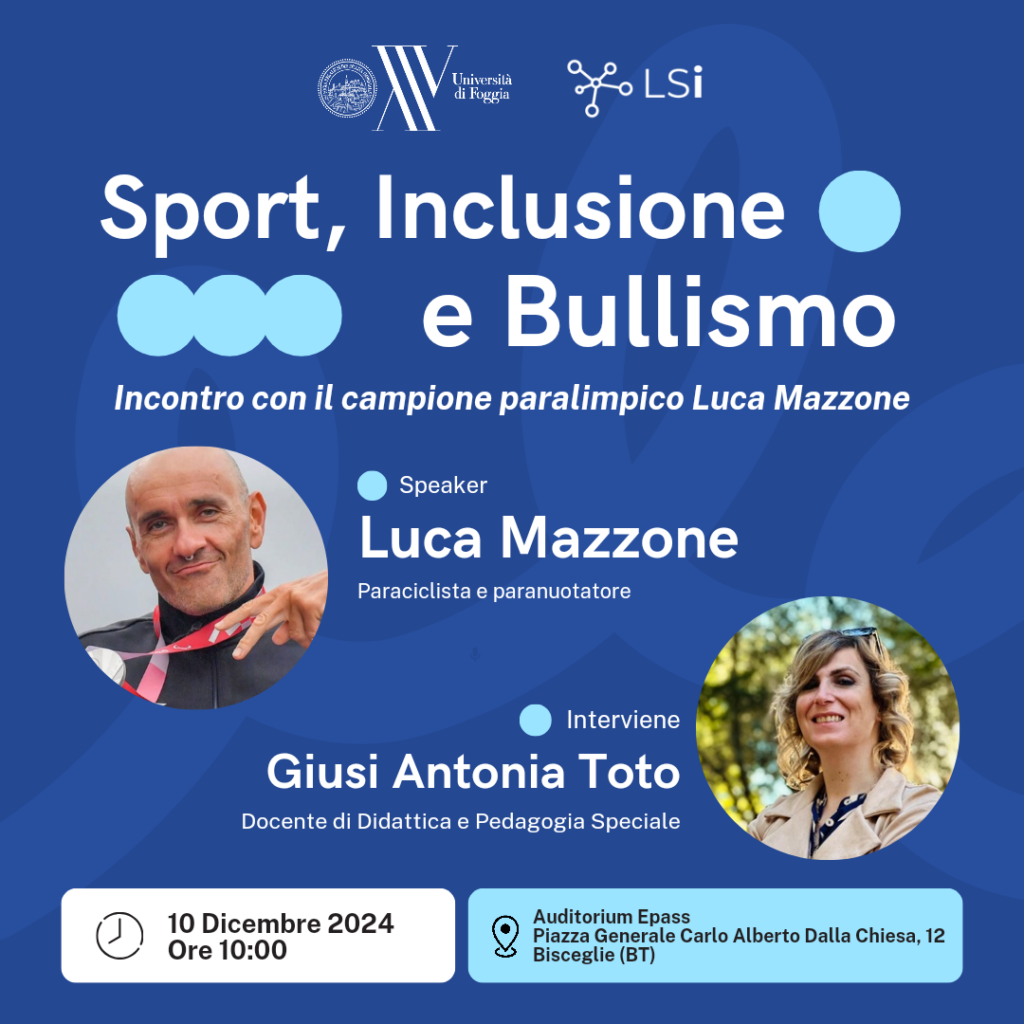 Il Learning Sciences institute (LSi) dell’Università di Foggia e l’Istituto Comprensivo S. Giovanni Bosco-Battisti-Ferraris di Bisceglie insieme per un evento straordinario che mette in evidenza il potere dello sport nel promuovere l’inclusione sociale, abbattere le barriere e favorire la coesione. L’appuntamento, dal titolo “Sport, inclusione e bullismo: incontro con il campione paralimpico Luca Mazzone”, si terrà il prossimo 10 dicembre 2024 presso l’Auditorium dell’Epass, in piazza Generale Carlo Alberto Dalla Chiesa, 12, a Bisceglie. L’evento, in programma a partire dalle ore 10:00, rappresenta un’occasione unica per riflettere sull’importanza dello sport come strumento educativo e sociale, capace di creare ponti tra le persone e favorire l’integrazione.