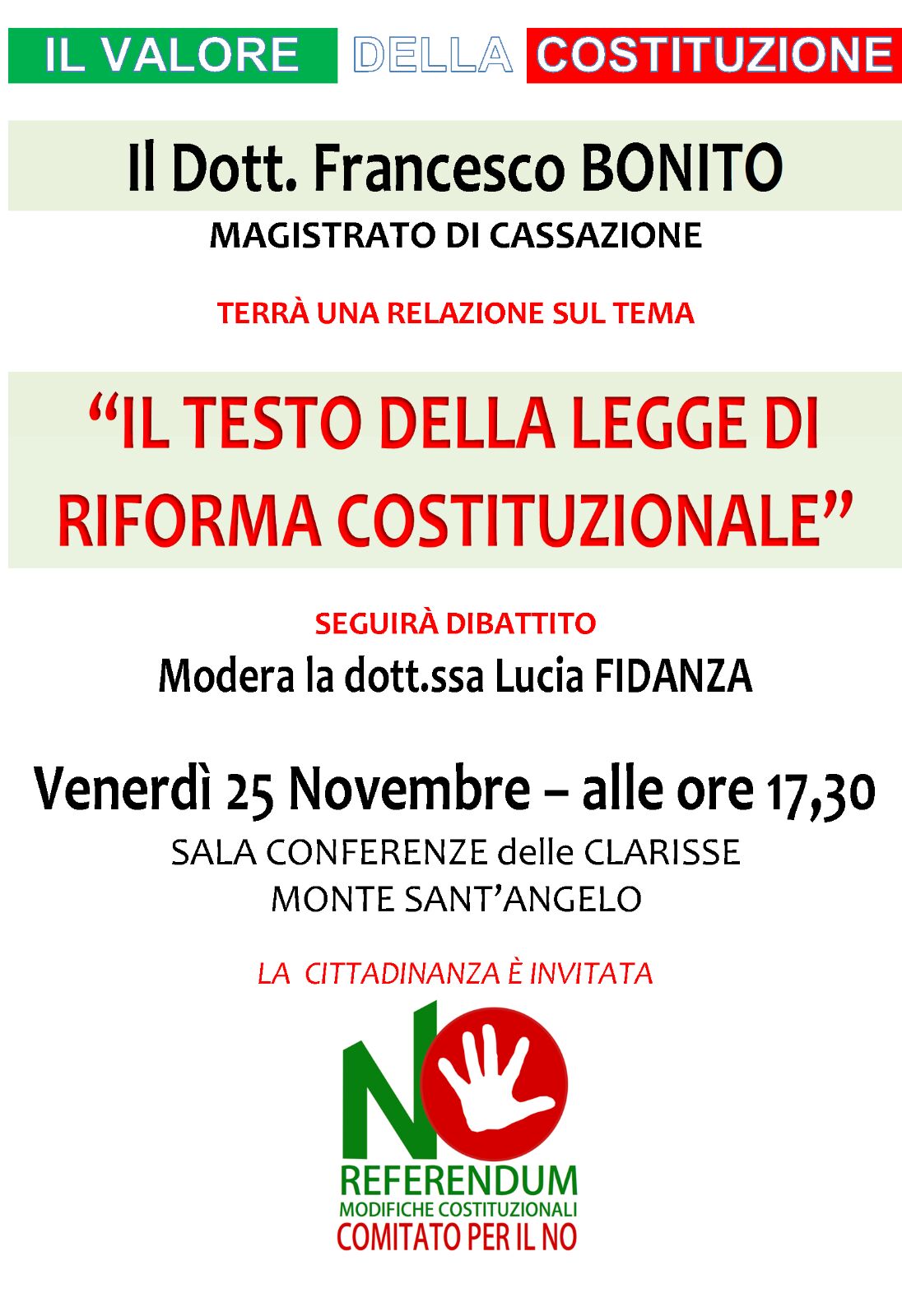 Il “Comitato per il No” al Referendum del 4 dicembre organizza a Monte Sant’Angelo, per venerdì 25 novembre 2016, con inizio alle ore 17.30, presso la Sala Conferenza delle Clarisse, un incontro sul tema “Il Testo della legge di Riforma Costituzionale”.