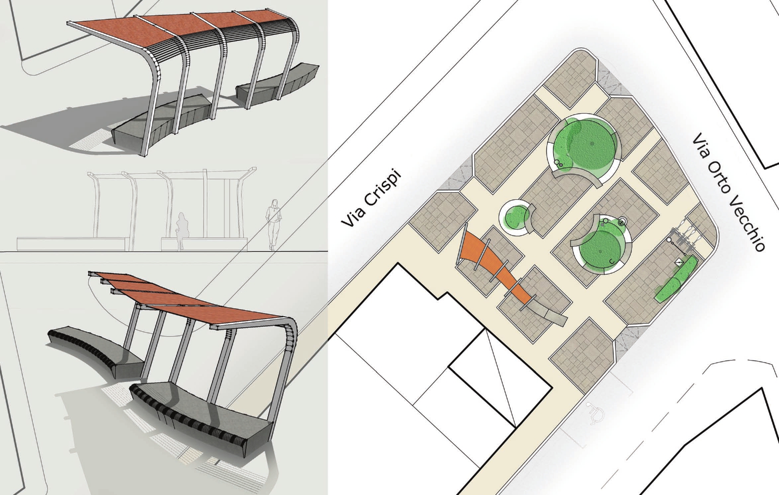 In particolare il progetto, finanziato interamente dalla Fondazione per circa 110 mila euro, ha previsto l’inserimento di spazi verdi organizzati in aiuole circolari di diverse dimensioni, dotate di sedute antigraffio (realizzate in cemento ed inerti di marmo di Apricena) e alberature ombreggiati; una pavimentazione innovativa del tipo “anti-smog fotocatalitica”, capace di abbattere l’inquinamento atmosferico, la cui sistemazione ha seguito le caratteristiche della trama a scacchiera della maglia urbanistica preesistente; una sinuosa pensilina ondeggiante in legno e alluminio, corredata di una panca realizzata con elementi prefabbricati; al posto dell’unico lampione attuale, sono stati collocati elementi integrati con l’illuminazione pubblica, vale a dire una serie di luci ad effetto alloggiate nelle aiuole ed alla base delle panchine. All’interno dell’area, infine, sono stati installati dei cestini per i rifiuti, una piccola zona parcheggio per le biciclette, dei paletti igienici per gli animali da passeggio ed un fontanino dotato di acqua corrente potabile.