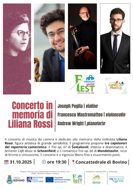 Il primo appuntamento, in programma venerdì 31 ottobre alle ore 19:30, è dedicato alla memoria di Liliana Rossi, violinista, musicista e intellettuale nata a Bovino il 4 novembre 1932, ricordata come una vera e propria “eroina della Capitanata”.