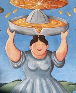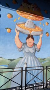L’opera è un omaggio al lavoro della gente di Vico. Le arance, come si sa, hanno costituito una parte significativa dell’economia locale sin dal tardo Medioevo, anche se le fonti che abbiamo non sono precise a riguardo. Il commercio dei preziosi agrumi prosperava in questa parte di Gargano e a inizio secolo questi erano esportati persino in America, data la loro capacità di conservarsi anche in condizioni estreme per lunghi periodi. L’idea è quella di una “spremuta di Vico”, una sorta di concentrato delle competenze, del duro lavoro e della storia che in questo luogo si sono accumulati.