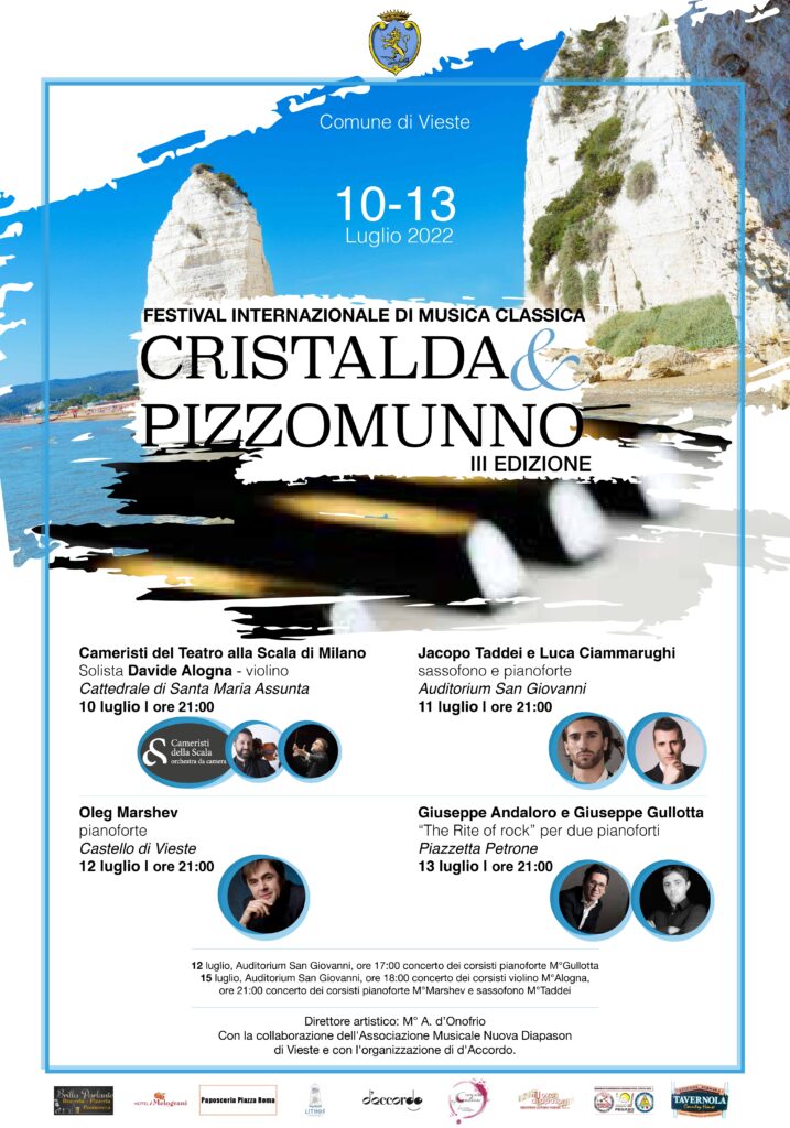 Al via la prima edizione di Vieste Summer Music Academy. In occasione della III edizione del Festival Internazionale di Musica “Cristalda & Pizzomunno” che avrà luogo a Vieste nei giorni dal 10 al 13 luglio e che vedrà come protagonisti in concerto “I Cameristi del Teatro alla Scala” con Davide Alogna al violino, Jacopo Taddei e Luca Ciammarughi, Oleg Marshev in recital, “The Rite of Rock” con l’esibizione di Giuseppe Andaloro e Giuseppe Gullotta, nasce a prima edizione della Vieste Summer Music Accademy.